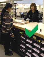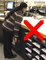 Clients will hand their ID card to the staff member who may lean over and pull the books towards them. This action puts strain on the lower back. Where possible, ask clients to push the items over the desk to you.